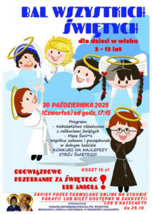 Zgłoszenia dzieci chętnych do wzięcia udziału w Balu Wszystkich Świętych można dokonywać przez formularz internetowy (link poniżej), u księży na lekcjach religii lub w zakrystii do 26 października 2025 r.